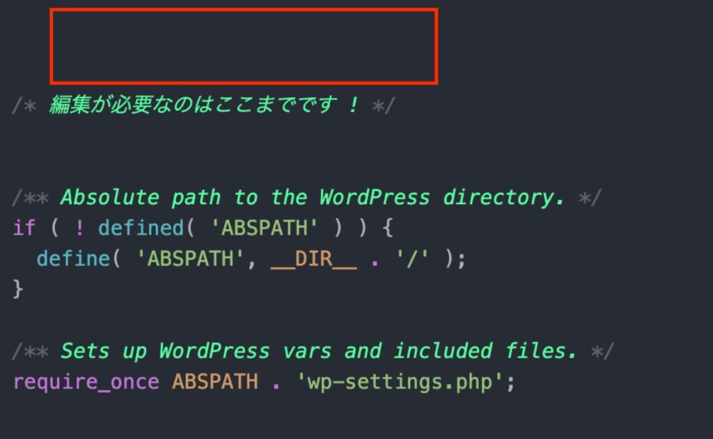 wp-config.phpファイルを見つけます。(データベース接続情 で使ったファイルと同じ)- ファイルを開き、