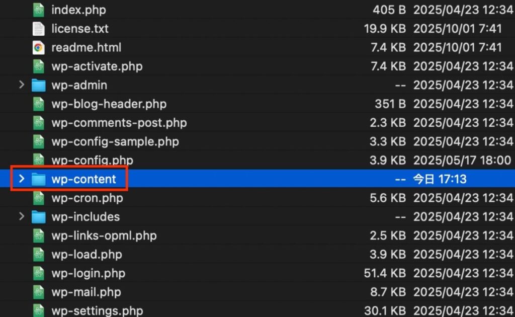 wp-contentは絶対に上書きしないでください。 テーマ、プラグイン、画像など、サイトの重要なデータが格納されています。これを上書きすると、サイトの全データが失われます。少しでも不安を感じたら、すぐに専門家へ相談ください。