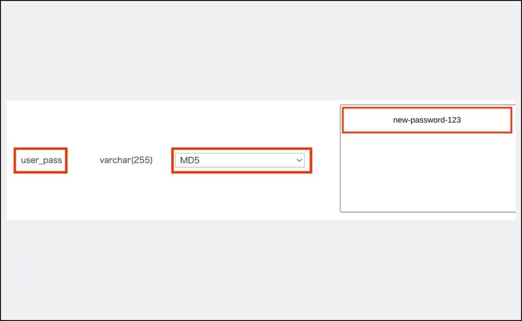 user_passという項目の行で、関数のプルダウンメニューから「MD5」を選択します。- 「値」の欄に、新しいパスワードを入力します。(例: