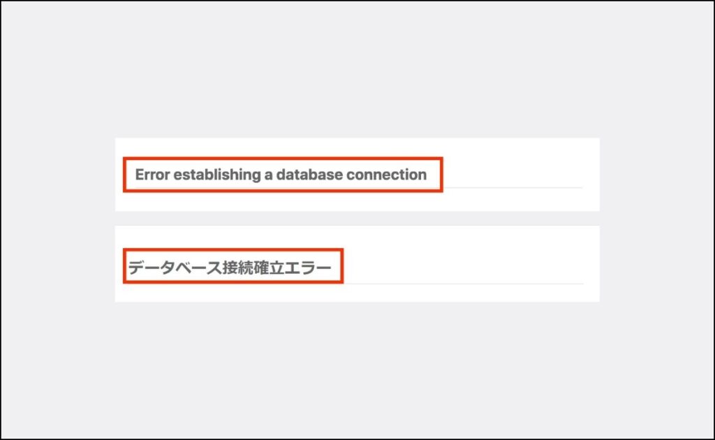 | 「データベース接続確立エラー」 | wp-config.phpファイル内のデータベース接続情報(ID/パスワード等)の間違い | データベース接続情報(wp-config.php)の確認 |