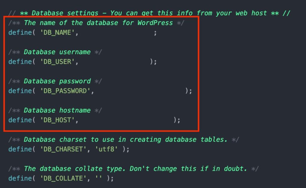 「データベース接続確立エラー」または「Error establishing a database connection」というエラーメッセージが表示される場合は、wp-config.phpファイルを開き、データベースの接続情報が正しいか確認・修正します。
