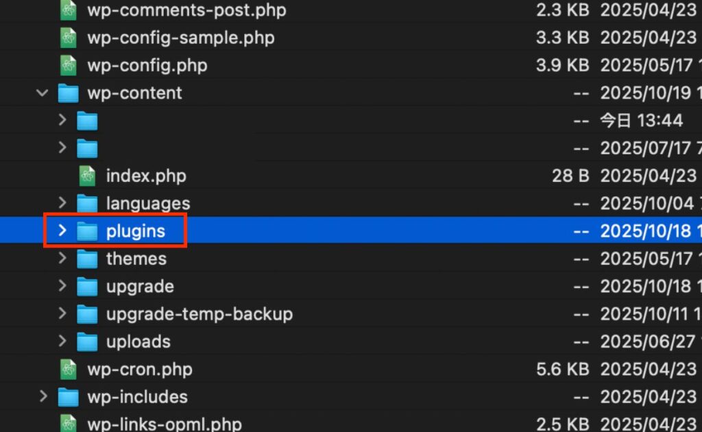 wp-contentフォルダを開きます。 wp-contentというフォルダを開きます。pluginsフォルダの名前を変更(リネーム)します。(例:plugins_old,plugins_stop)- この操作で全プラグインが強制的に無効化されます。