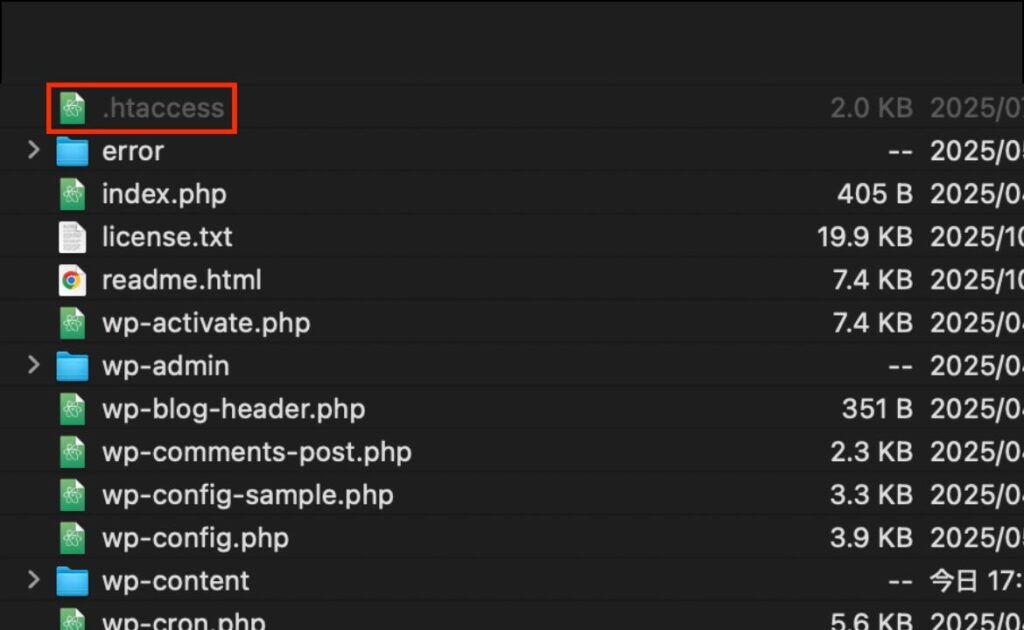 .htaccessファイルは、サイトの表示ルールなどを決める重要な設定ファイルです。このファイルに誤った記述があると、ログインできなくなることがあります。ファイルをリネーム(無効化)し、WordPressに再生成させます。